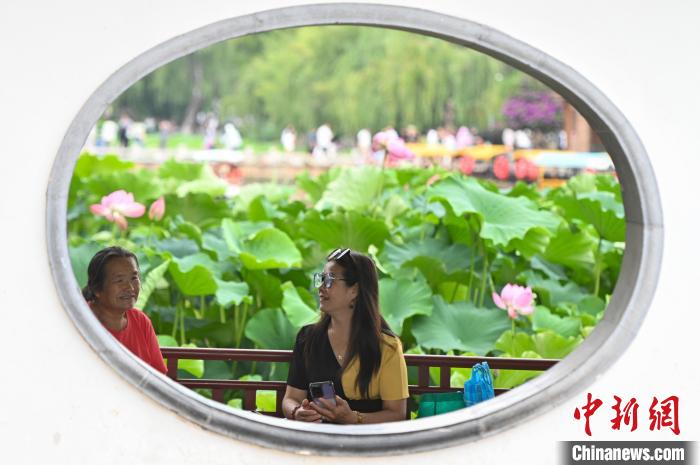 6月17日,荷花吸引游客拍照。近日,云南省昆明市大觀公園內(nèi)荷花初放,吸引不少游客前來(lái)賞花、拍照。中新社記者 李嘉嫻 攝
