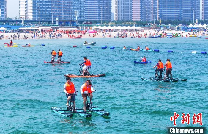 7月13日,山東威海榮成市一處海水浴場(chǎng),游客們體驗(yàn)各種水上娛樂項(xiàng)目,消夏避暑。進(jìn)入夏季旅游旺季,洗海澡、槳板、摩托艇等“親水游”項(xiàng)目備受青睞。(無(wú)人機(jī)照片) 李信君 攝