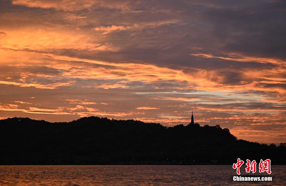 8月21日,浙江杭州西湖出現(xiàn)壯美晚霞,橙紅色的夕陽鋪滿云端和湖面,美不勝收。中新社記者 王剛 攝