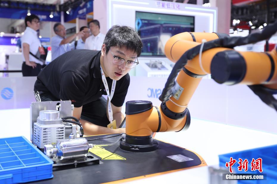 參展商調(diào)試機(jī)械臂。中新社記者 張祥毅 攝