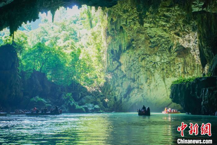 8月27日,中外游客在廣西河池市巴馬瑤族自治縣乘舟游覽百鳥巖。百鳥巖又名水波天窗,是中國國家4A級盤陽河景區(qū)的核心景點(diǎn),“天窗”是巖溶洞穴洞壁或者天篷上因溶蝕、坍陷而漏出的中、大型窗式天然框景景觀。陽光透過天窗射入漆黑的洞內(nèi),造就了黑白陰陽兩界,光怪陸離,天然成畫。中新社記者 陳冠言 攝