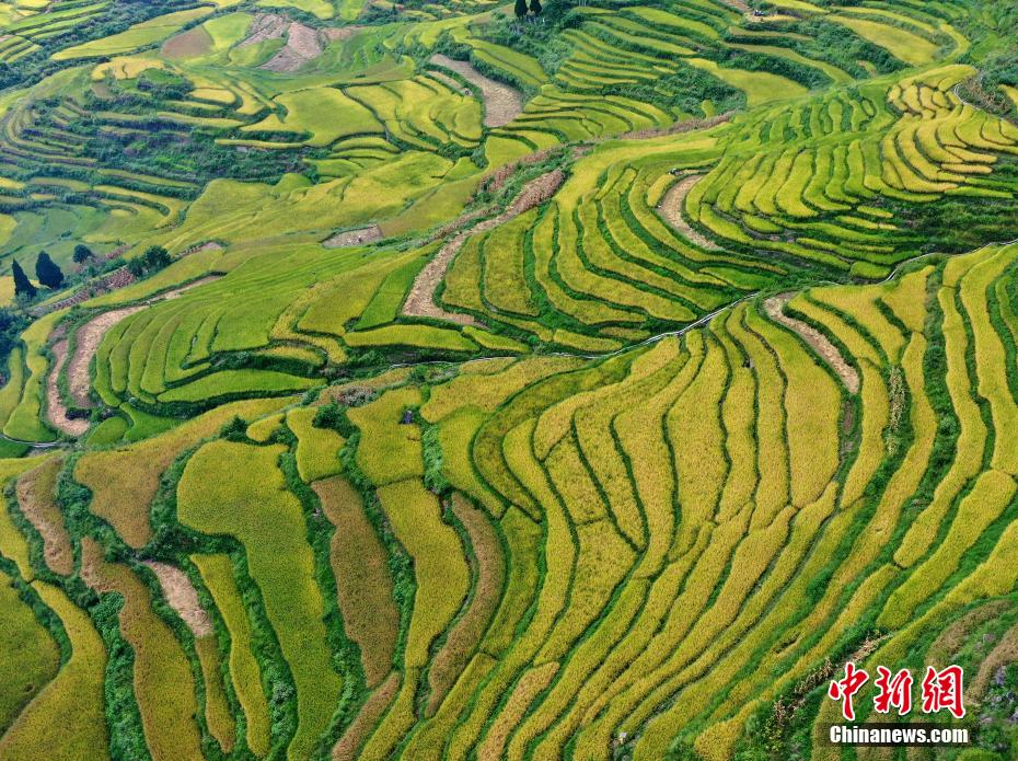 近日,重慶市酉陽土家族苗族自治縣花田鄉(xiāng)何家?guī)r村的萬畝梯田進(jìn)入了秋季最佳觀賞期。從空中俯看,一層層田壟沿著山坡向下伸展,次第鋪開,蜿蜒柔和的線條,猶如大地的指紋,金色的稻穗隨風(fēng)起舞,掀起層層碎金波浪。梯田、村寨交相輝映,構(gòu)成一幅醉人的鄉(xiāng)村田園豐收畫卷,美不勝收。段成軍 攝