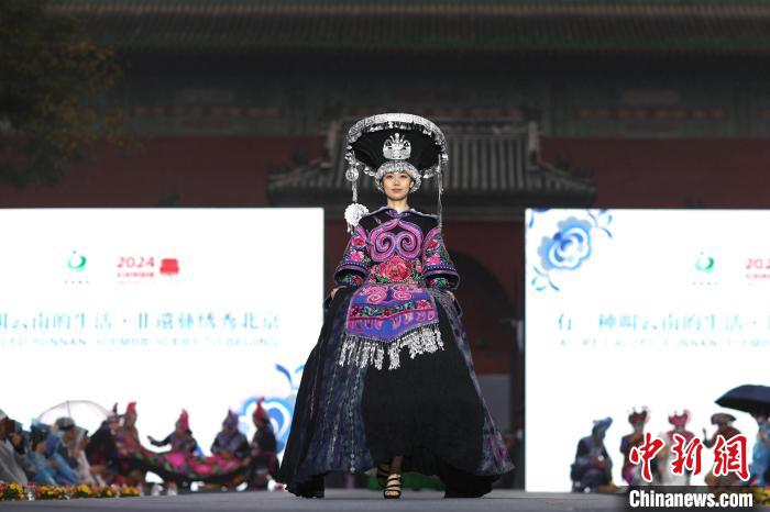 10月13日,“有一種叫云南的生活·非遺彝繡秀北京”活動(dòng)在北京鐘鼓樓廣場舉行。來自云南省楚雄彝族自治州的原生態(tài)非遺服飾、以綠孔雀元素作為創(chuàng)意理念的系列服飾、“福來云往”系列服裝先后呈現(xiàn)。楚雄彝族服飾擁有1700多年的傳承歷史,被譽(yù)為“穿在身上民族史書”。2014年,楚雄彝族服飾被列為國家級(jí)非物質(zhì)文化遺產(chǎn)。圖為原生態(tài)非遺彝繡服飾展示。中新社記者 蔣啟明 攝