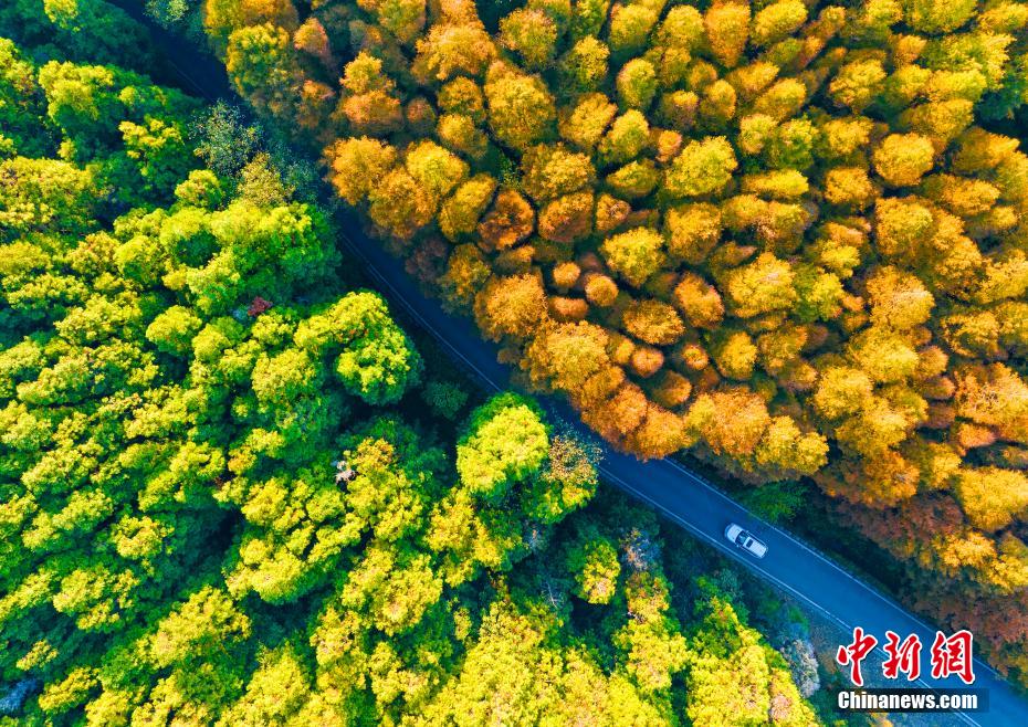 10月29日,重慶南川山王坪喀斯特國家生態(tài)公園的水杉林逐漸變黃,翠綠的柳杉和變黃的水杉再次呈現(xiàn)了春秋同框的畫意森林。圖為航拍重慶南川山王坪秋色如畫。胡波 攝
