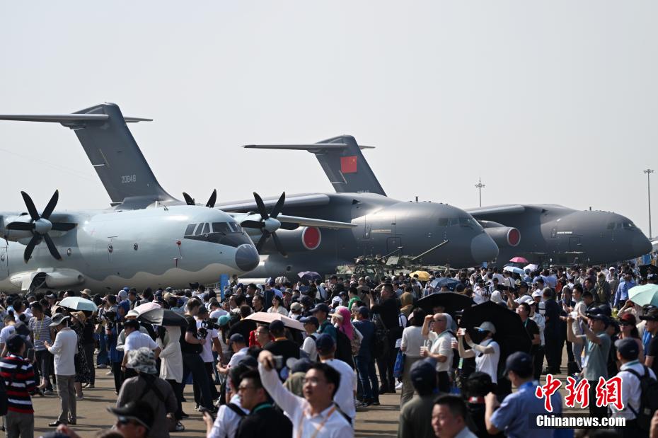 11月12日,廣東珠海,第十五屆中國(guó)國(guó)際航空航天博覽會(huì)開幕。本屆航展吸引47個(gè)國(guó)家和地區(qū)的1022家企業(yè)參展。其中,俄羅斯、法國(guó)、美國(guó)、沙特、意大利以展團(tuán)形式參展,境外展商159家,比上屆航展增長(zhǎng)104%。圖為現(xiàn)場(chǎng)展示的運(yùn)油-20A飛機(jī)(中)等機(jī)型吸引參觀者。中新社記者 陳楚紅 攝