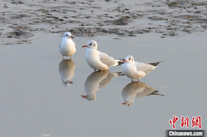11月17日,三只紅嘴鷗在水面棲息。初冬時節(jié),位于青島市城陽區(qū)的濱海濕地迎來成群紅嘴鷗、綠頭鴨、蒼鷺等候鳥覓食棲息,準(zhǔn)備越冬。王海濱 攝