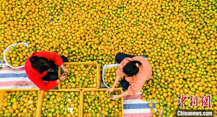 近日,廣西梧州岑溪市筋竹鎮(zhèn)馬芹村,果農(nóng)在分揀、裝運(yùn)特色水果陳皮柑,待銷往粵港澳大灣區(qū)陳皮市場。初冬時(shí)節(jié),梧州市陳皮柑喜獲豐收,種植陳皮柑是實(shí)現(xiàn)產(chǎn)業(yè)轉(zhuǎn)型升級(jí)、促進(jìn)農(nóng)民增收致富的新路徑。 顏桂海 攝
