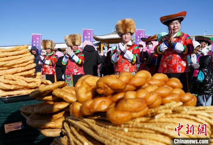 11月26日,土族民俗傳統(tǒng)饃饃比賽在高原“土鄉(xiāng)”——青海省海東市互助土族自治縣舉行,129名巧手廚娘各顯身手,制作出炸馓子、“翻跟頭”、焜鍋饃饃、“背口袋”、花卷等焜、炸、烙、蒸四大系列共十個(gè)品種的土族傳統(tǒng)饃饃“佳作”,引眾多民眾品嘗了解。圖為比賽現(xiàn)場(chǎng)展出的土族民俗傳統(tǒng)饃饃。中新社記者 馬銘言 攝