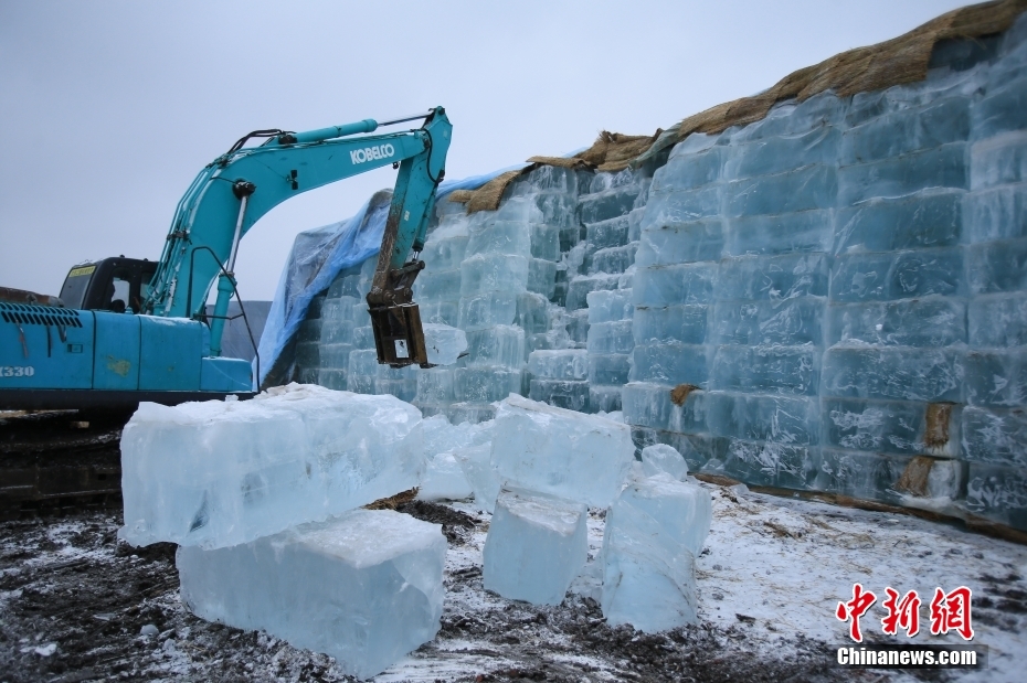 11月26日,黑龍江哈爾濱,工程車輛從冰垛上取冰。日前,第二十六屆哈爾濱冰雪大世界存冰開始啟用,預(yù)計于27日投入冰建施工。本屆哈爾濱冰雪大世界主題為“冰雪同夢 亞洲同心”,園區(qū)設(shè)計和建設(shè)將充分融合亞冬會元素,整體面積將擴大到100萬平方米,總用冰用雪量30萬立方米,打造歷屆規(guī)模最大的冰雪主題樂園。中新社發(fā) 于琨 攝