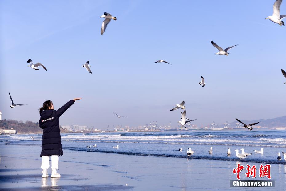 12月24日早晨,山東煙臺,民眾在第一海水浴場海濱喂食海鷗。海鷗們一躍而起,爭搶食物,成為冬日里一道獨特風(fēng)景。中新社記者 王嬌妮 攝