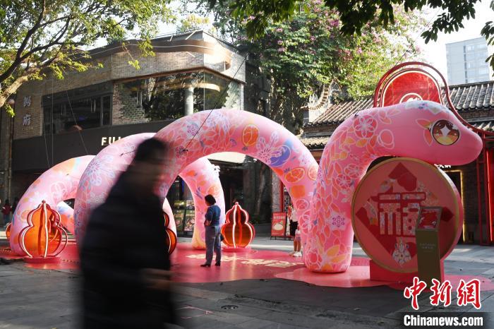 1月8日,廣東省佛山市嶺南天地的“萌蛇”裝置吸引游客。中新社記者 陳楚紅 攝