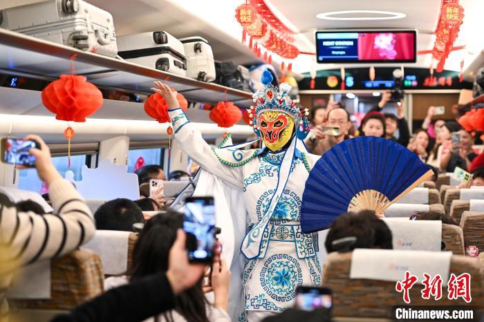 1月22日,在G8611次復(fù)興號動車組車廂內(nèi),旅客觀賞川劇變臉表演。當(dāng)日是農(nóng)歷臘月二十三日,正值中國傳統(tǒng)小年,在成都東開往沙坪壩的G8611次成渝城際復(fù)興號高鐵舉辦了川劇變臉、舞獅等非遺表演,讓旅客在春運(yùn)旅途中也能近距離欣賞非遺,感受濃濃的年味。中新社記者 何蓬磊 攝