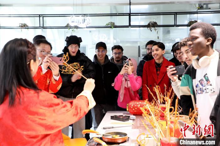 1月24日,糖畫(huà)藝人向留學(xué)生教授糖畫(huà)制作技巧。當(dāng)日,在位于山東省青島西海岸新區(qū)的山東科技大學(xué),來(lái)自伊朗、印度尼西亞等10余個(gè)國(guó)家的70余名留學(xué)生相聚一堂,沉浸式體驗(yàn)剪紙、糖畫(huà)等非遺技藝,親身感受“中國(guó)年”。郭菁荔 攝