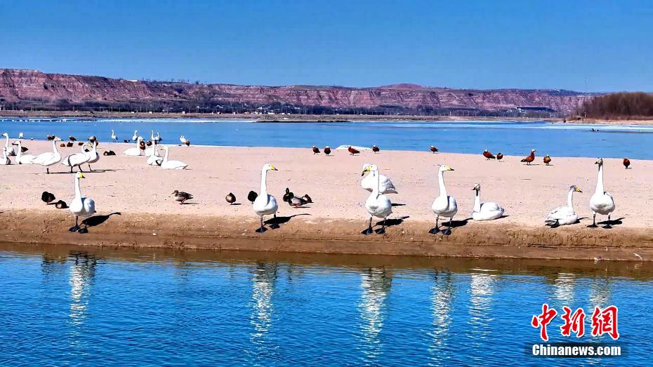 近日,被譽(yù)為“黃河入陜第一縣”的陜西省榆林市府谷縣氣溫逐漸回升,黃河入陜段冰雪漸消,天鵝、綠頭鴨等大批候鳥在此駐足。它們時(shí)而在冰面或淺灘上佇立,時(shí)而在河水中游弋,為黃河增添生機(jī)與活力。圖為初春時(shí)節(jié),黃河入陜段迎大批候鳥。樊仲森 攝