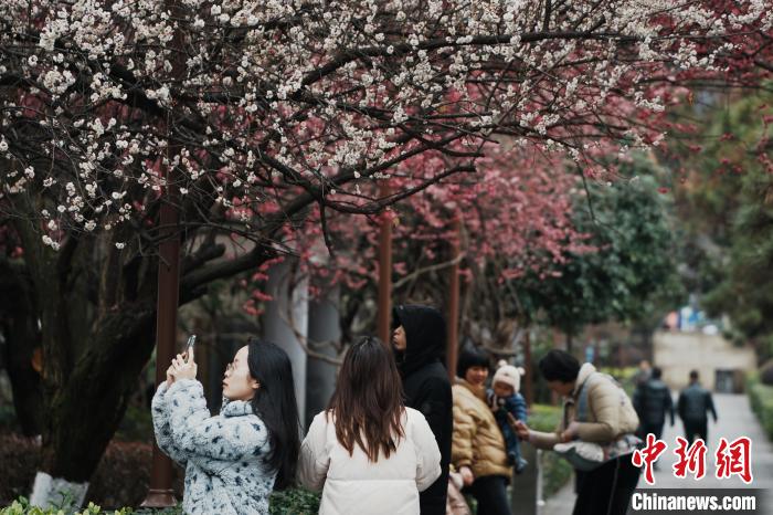 2月23日,貴陽市甲秀樓附近的梅花競相綻放,粉白相間的梅花綴滿枝頭,散發(fā)出陣陣淡雅的清香,吸引不少市民游客賞梅拍照。周燕玲 攝