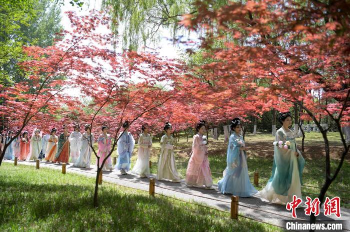 4月19日,山東省濟(jì)南市植物園內(nèi)牡丹、櫻花、杜鵑等多種春花競(jìng)相綻放,“花仙子”們?cè)阪弊湘碳t的花海中巡游,與游客一起共賞春日美景。圖為“花仙子”們?cè)跐?jì)南植物園內(nèi)巡游。中新社記者 張勇 攝