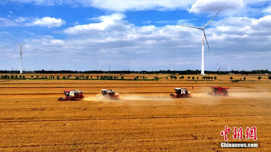 近日,河北省衡水市阜城縣42.4萬畝小麥?zhǔn)崭钸M(jìn)入尾聲,當(dāng)?shù)卣{(diào)配1000余臺小麥聯(lián)合收割機(jī)、各類農(nóng)業(yè)機(jī)械2500余臺投入到“三夏”作業(yè)之中,確保夏糧顆粒歸倉。圖為6月16日,阜城縣碼頭鎮(zhèn)李晉莊村的農(nóng)田里,小麥聯(lián)合收割機(jī)正在作業(yè)。薛騰飛 攝