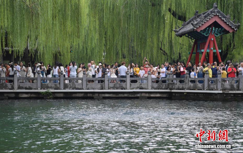8月18日,受近期持續(xù)降雨影響,山東省濟南市趵突泉地下水位攀升至28.89米,泉水噴涌勢頭強勁,趵突泉“水涌若輪”美景重現(xiàn)。圖為游客正在觀賞趵突泉。