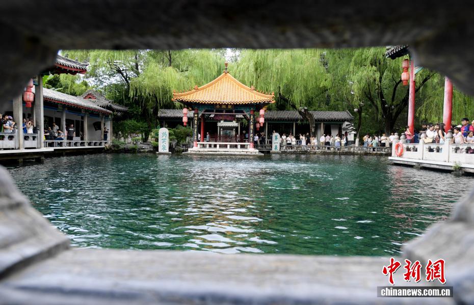 8月18日,受近期持續(xù)降雨影響,山東省濟(jì)南市趵突泉地下水位攀升至28.89米,泉水噴涌勢(shì)頭強(qiáng)勁,趵突泉“水涌若輪”美景重現(xiàn)。圖為游客正在觀賞趵突泉。