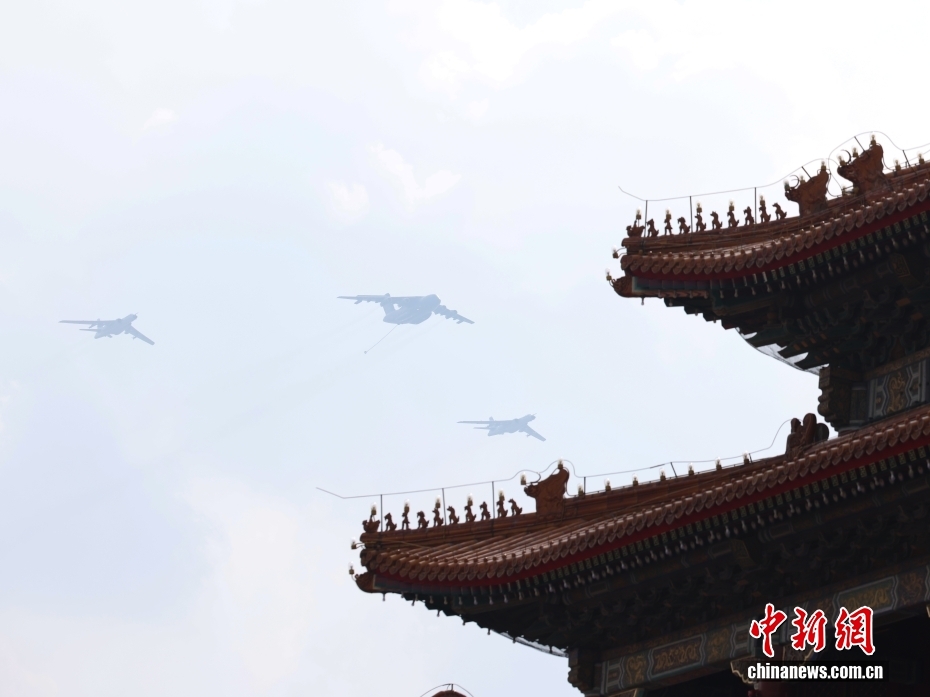 9月3日,紀(jì)念中國(guó)人民抗日戰(zhàn)爭(zhēng)暨世界反法西斯戰(zhàn)爭(zhēng)勝利80周年大會(huì)在北京隆重舉行。圖為空中梯隊(duì)飛過(guò)天安門(mén)上空。中新社記者 蔣啟明 攝