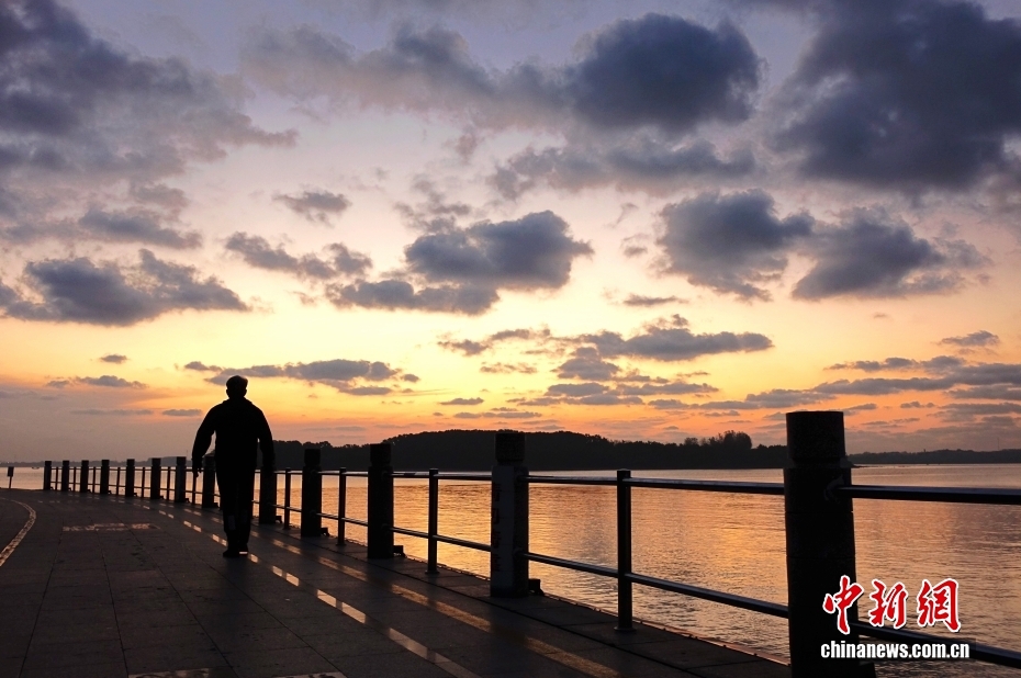 11月6日,山東青島,日出時分,西海岸唐島灣上空變幻的云霞與大海相映,油畫般絢美。