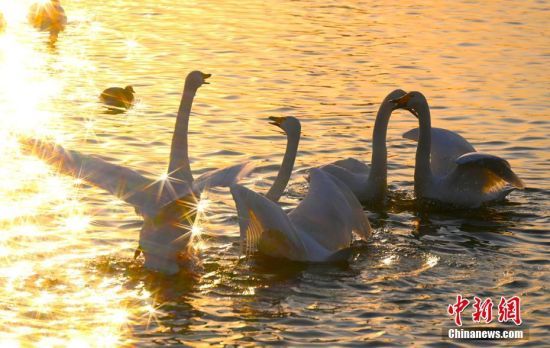 2月21日,山東省榮成市城市櫻花湖,大天鵝相依相戀,成雙成對,構(gòu)成一幅醉人畫卷。山東榮成是我國大天鵝重點遷徙棲息地,每年入冬前10月底,大批天鵝從西伯利亞遷徙到榮成越冬,至來年3月初回遷。中新社發(fā) 楊志禮 攝 圖片來源:CNSphoto