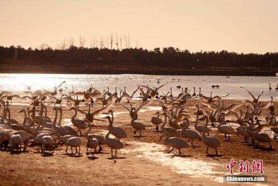 2月26日,大批天鵝在山東榮成成山天鵝湖晨曦中結(jié)伴啟程,場(chǎng)面壯觀。隨著天氣轉(zhuǎn)暖,山東榮成的石島灣、櫻花湖、煙墩角海灣和成山天鵝湖等地總共有一半以上的大天鵝已經(jīng)飛走,預(yù)計(jì)三月初北遷結(jié)束。