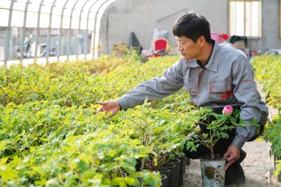 在山東省菏澤市牡丹區(qū)黃堽鎮(zhèn),農(nóng)民高級(jí)農(nóng)藝師李曉奇在觀察盆栽牡丹生長情況 徐速繪 攝
