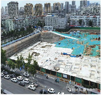 7月5日,齊魯晚報(bào)·齊魯壹點(diǎn)記者來(lái)到位于山大路與花園路交叉口的施工現(xiàn)場(chǎng),所有入口都大門緊閉。透過(guò)圍擋,未看到施工人員及車輛。從周邊高樓往下看,項(xiàng)目目前還是一個(gè)“坑”,地基部分約4個(gè)足球場(chǎng)大小。