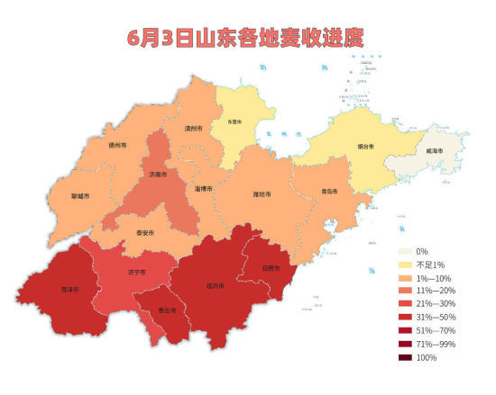 從各地來看,南部麥區(qū)收獲進(jìn)入高峰,魯中地區(qū)逐步加快,其他區(qū)域零星展開。其中,棗莊、臨沂已收獲近五成,菏澤過四成,日照過三成,濟(jì)寧近三成,濟(jì)南過一成。