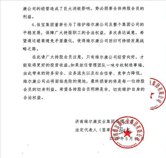 值得注意的是,通告第三條稱:“自2024年11月至今,因維爾康公司上屆管理層個別人員拒不離崗,導致維爾康公司多項業(yè)務難以正常推進,給維爾康公司的經(jīng)營造成了巨大消極影響,勢必損害全體持股會員的利益!