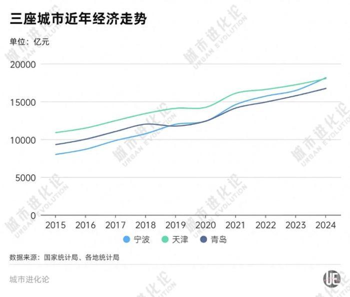 2024年,天津GDP為18024.32億元,被寧波反超,GDP排名滑落至第12位;同期青島GDP達(dá)到16719.46億元,緊隨天津之后,兩座城市的差距也縮小至1300億元左右。