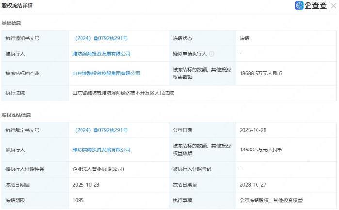 濰坊濱海經(jīng)濟(jì)技術(shù)開發(fā)區(qū)人民法院執(zhí)行通知文書(2024)魯0792執(zhí)291號顯示,因股東之一濰坊濱海投資發(fā)展有限公司成為被執(zhí)行人,山東鐵路投資控股集團(tuán)有限公司(簡稱“山東鐵投集團(tuán)”)被凍結(jié)股權(quán),股權(quán)數(shù)額18688.5萬元。