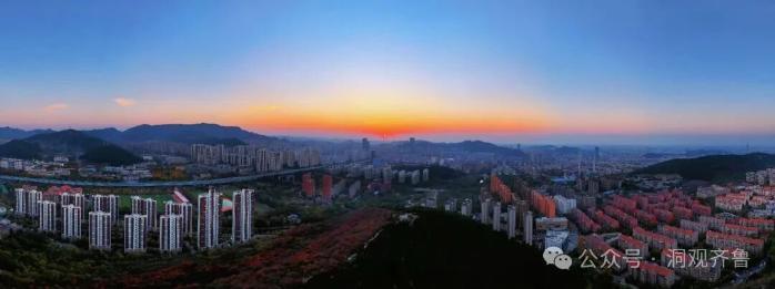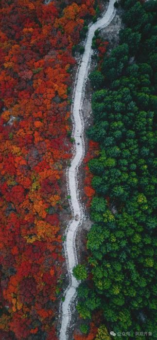 濟(jì)南蝎子山形似翹尾蝎子,靜臥在城市脈絡(luò)中。山脊天然劃界,將秋意一分為二,北坡松柏疊翠,南坡黃櫨燃紅,航拍視角下,蝎子山就像一鍋煮沸的秋日“鴛鴦鍋”,每一幀都是壁紙。