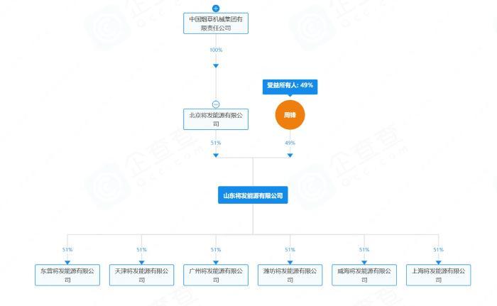 股權穿透顯示,該公司由北京將發(fā)能源有限公司(持股51%)與自然人周峰(持股49%)聯(lián)合控股,而北京將發(fā)能源是中國煙草機械集團有限責任公司的全資子公司。