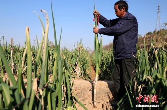 蔥農(nóng)在田間查看大蔥長勢。 趙曉 攝