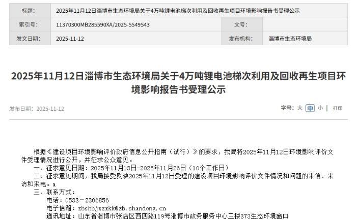 近日,淄博市生態(tài)環(huán)境局對山東鵬順環(huán)保科技有限公司(下稱“鵬順環(huán)!保4萬噸鋰電池梯次利用及回收再生項(xiàng)目”環(huán)境影響報告書進(jìn)行受理公示,標(biāo)志著總投資3億元的鋰電池回收項(xiàng)目正式啟動審批程序。