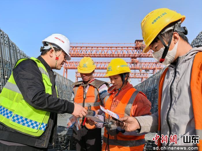 中新網(wǎng)山東新聞11月28日電(姚慶國)“上班之前想一想,安全防護(hù)不能忘”。近日,在中鐵上海局濰宿高鐵郯城制梁場制梁區(qū)域,現(xiàn)場工人之間互相傳唱著這樣的安全順口溜。這是該梁場為切實加強(qiáng)冬季現(xiàn)場施工安全,為農(nóng)民工發(fā)放的安防“口袋書”中的內(nèi)容。