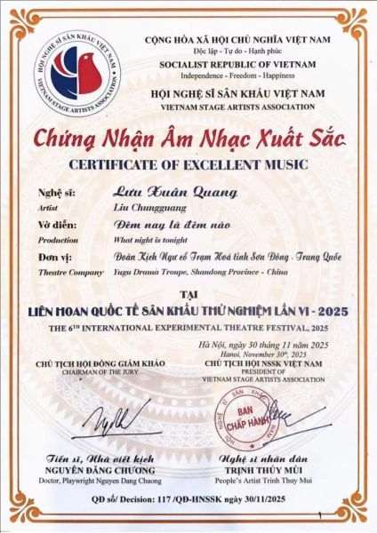 2025年第六屆國際實驗戲劇節(jié)于11月20日至30日在越南寧平舉辦,來自十多個國家的29個劇種劇目入圍最終決賽圈,最終評選出特等獎兩個、一等獎8個。沾化漁鼓戲《今夕何夕》因去年在東盟國際戲劇周的驚艷亮相,成為本屆戲劇節(jié)決賽階段公認(rèn)的種子劇目,最終憑借高藝術(shù)水準(zhǔn)、高觀眾口碑,贏得國際評委團(tuán)和現(xiàn)場觀眾的一致稱贊,斬獲最高獎,成為最大贏家。