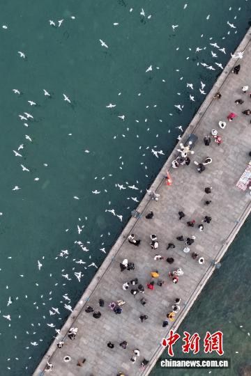 12月2日,山東青島,人與海鷗共赴的 “年度之約”。成群的銀鷗舒展雙翼,在碧海藍(lán)天間翩躚盤旋,時而低空掠過海面,時而停落肩頭覓食,與前來打卡的市民游客近距離互動,讓 “人與海鷗和諧共處” 成為這座濱海城市的初冬名片。(無人機(jī)照片)中新社發(fā) 王鑫 攝