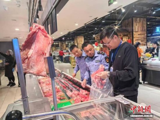 在菏澤市巨野縣某超市,工作人員仔細核對肉類商品的檢疫證明與新鮮度,確保每份產(chǎn)品安全達標。巨野縣委宣傳部供圖