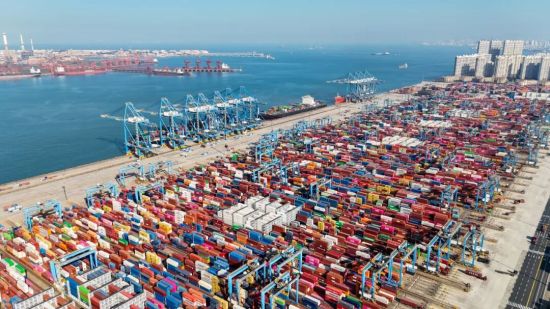 山東港口青島港全自動(dòng)化碼頭一派繁忙。(資料圖)中新社發(fā) 張進(jìn)剛 攝