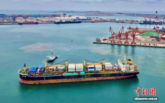 12月12日,山東港口煙臺(tái)港龍口港區(qū),“金澳”輪載貨出港。陳宏文 攝