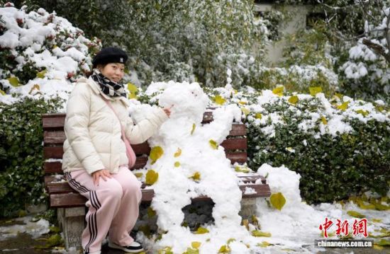 12月13日,濟(jì)南趵突泉公園,市民與雪人拍照。中新社記者 張勇 攝