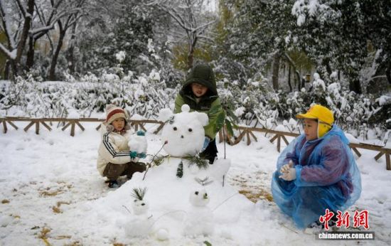 12月13日,濟(jì)南大明湖畔,市民堆雪人。中新社記者 張勇 攝