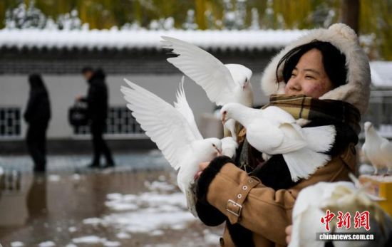 12月13日,濟(jì)南泉城廣場,市民在雪景中喂鴿子。雪后,山東省濟(jì)南市銀裝素裹,不少市民來到戶外,樂享雪后風(fēng)光。中新社記者 張勇 攝