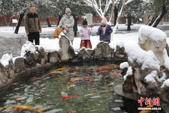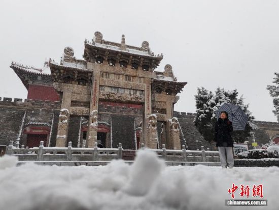 12月13日,山東泰安,岱廟銀裝素裹,白雪覆蓋青瓦飛檐,紅墻映雪,吸引游客駐足觀賞。陳陽 攝