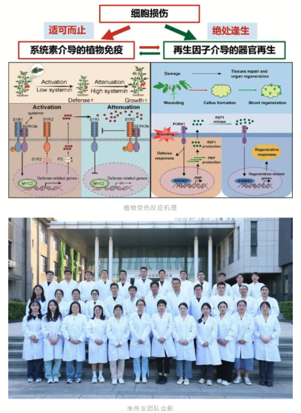 “是什么控制著器官再生”是《科學(xué)》雜志在2005年創(chuàng)刊125周年之際提出的125個(gè)人類未知的重大科學(xué)問題中最重要的25個(gè)科學(xué)問題之一。該成果以番茄為模式植物,深度解析由系統(tǒng)素和茉莉酸共同調(diào)控的植物系統(tǒng)性防御信號通路,成功發(fā)現(xiàn)細(xì)胞受傷而產(chǎn)生的再生因子REF1是引發(fā)組織修復(fù)和器官再生的原初受傷信號分子,揭示了其通過激活干細(xì)胞調(diào)控再生的機(jī)理,探明了利用REF1打破物種和基因型限制,大幅提高作物遺傳轉(zhuǎn)化效率的便捷技術(shù)路徑,不僅回答了“是什么控制器官再生”的世紀(jì)之問,而且為破解現(xiàn)代生物育種瓶頸問題開辟了新路徑。