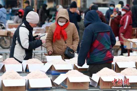 1月29日,山東省濱州市沾化區(qū),春節(jié)將近,市民在馮家鎮(zhèn)“黃河大集”上購(gòu)買(mǎi)特產(chǎn)蝦醬。中新社記者 梁犇 攝