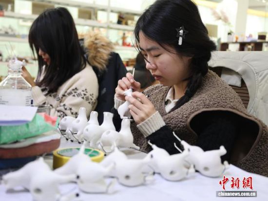 圖為工作人員在用軟陶捏制“馬彪彪”。趙曉 攝